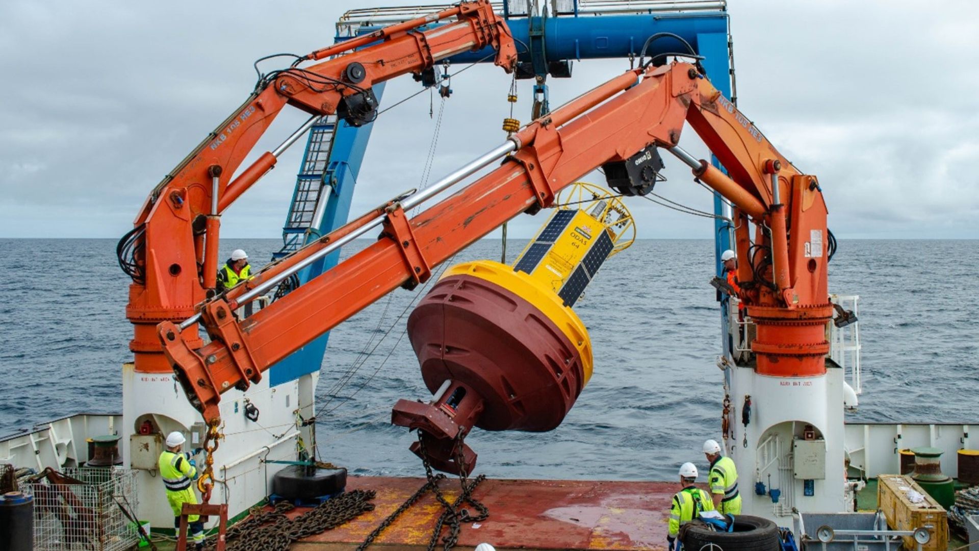 Each buoy stands 7 metres tall, 3.6 metres wide, and weighs around 4.5 tonnes. Anchored by synthetic ropes stretching 5 kilometres to the ocean floor, they are designed to operate for up to two years between service visits - even in extreme conditions and stormy seas.