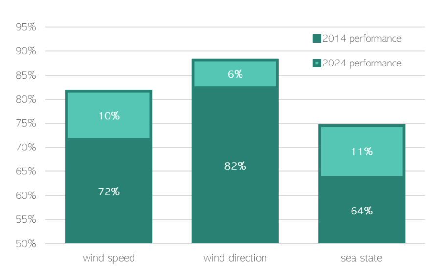 Figure 2: Bar chart illustrating the progress made in Shipping Forecast accuracy for wind speed, wind direction, and sea state. Comparing the performances during 2014 and 2024, the chart shows significant improvements: Wind speed accuracy rose from 72% to 82%, wind direction from 82% to 88%, and sea state from 64% to 75%.