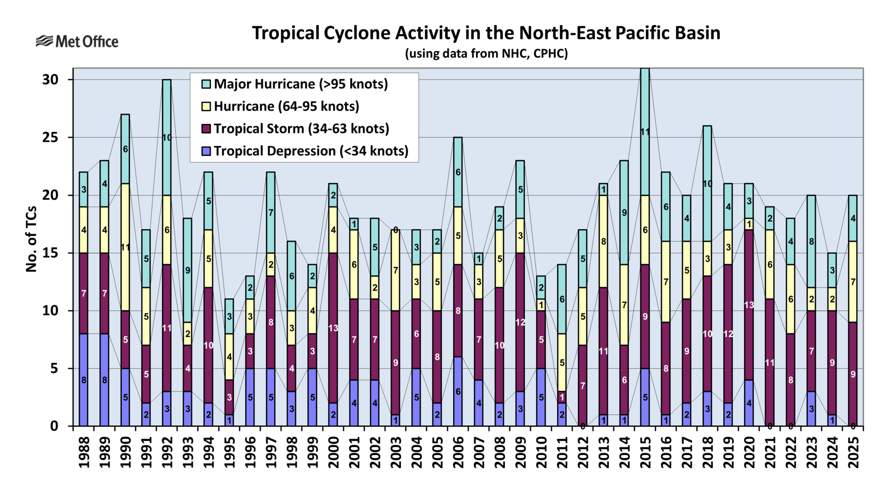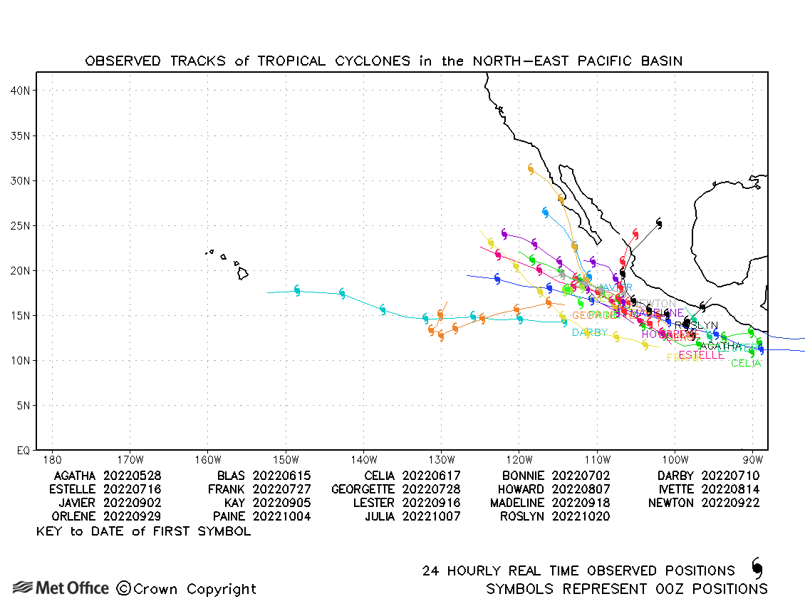 The charts show tropical cyclone activity in the North-East Pacific Ocean since 1988 and tracks for the most recent completed seasons.