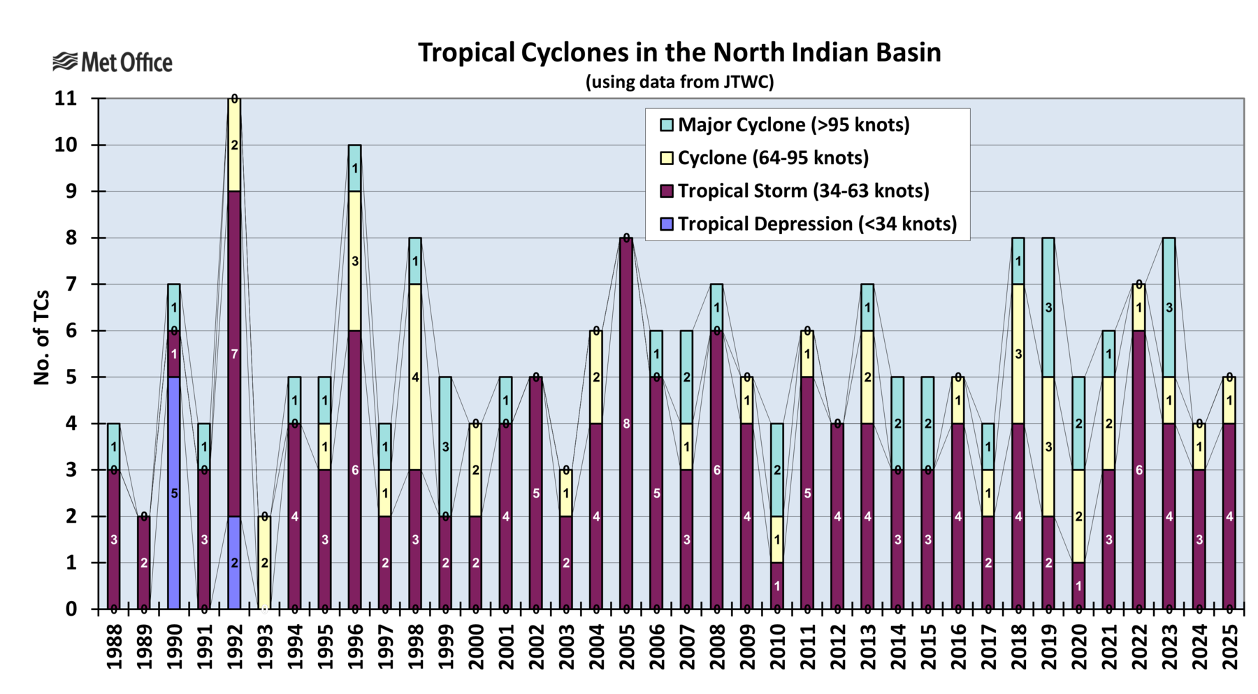 The charts show tropical cyclone activity in the North Indian Ocean since 1988 and tracks for the most recent completed seasons.