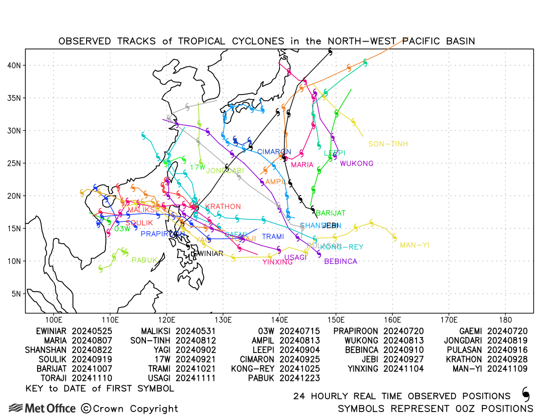 The charts show tropical cyclone activity in the North-West Pacific Ocean since 1988 and tracks for the most recent completed seasons.