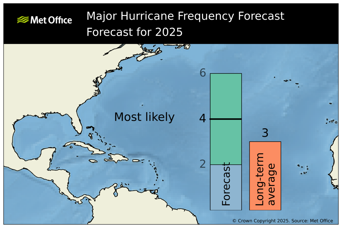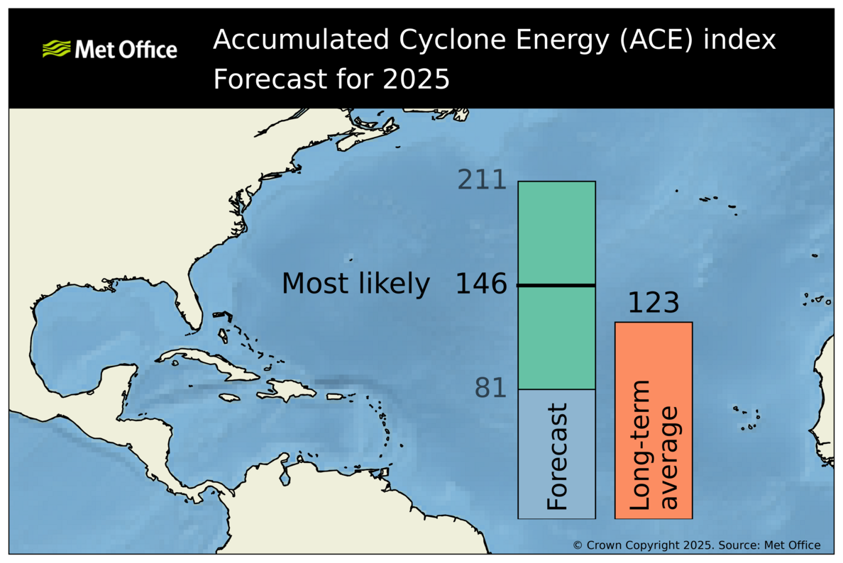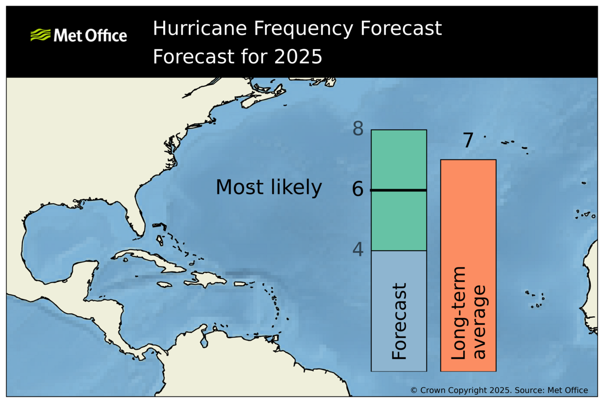 There is a signal in seasonal models for continued neutral El Niño Southern Oscillation (ENSO) conditions through to the peak of the Atlantic hurricane season (August to October 2025).Vertical wind shear is predicted to be lower-than-normal in large parts of the tropical and subtropical North Atlantic and Caribbean Sea. Sea-surface temperatures are forecast to be warmer than average in most of the tropical and subtropical North Atlantic, although not as high as the exceptional values seen in 2024. Whilst these factors would favour tropical storm activity in the North Atlantic, a forecast positive anomaly in surface pressure is not so favourable. However, when all factors are considered together the conditions appear to be favourable for most likely above average activity in the Atlantic, as seen by most measures in the 2025 forecast.