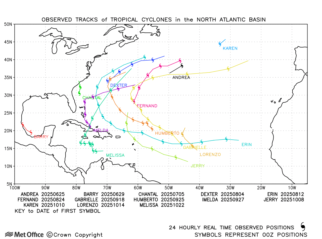All values given below represent observed activity for the 6-month period from February to July 2025 plus the 6-month GloSea6 forecast activity from August 2025 to January 2026. Note, the official tropical storm season, which usually includes most activity, is from June-November.