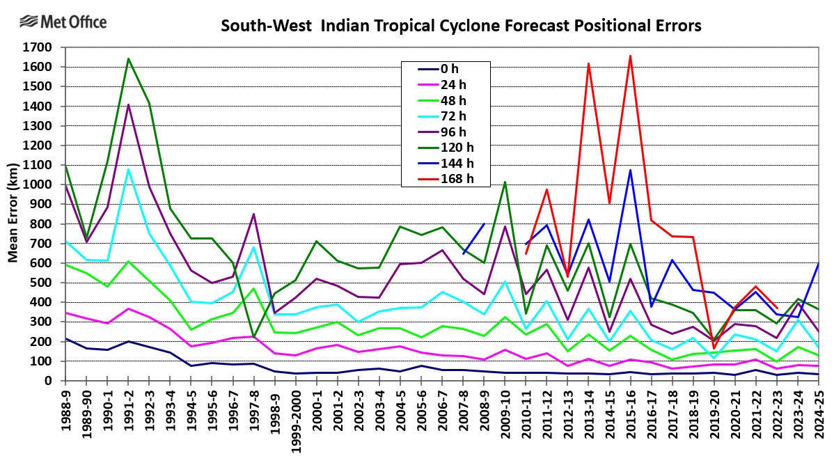 The graphs below show a variety of measures of forecast errors and forecast skill for the Met Office global model forecasts of tropical cyclones in the South-West Indian region (west of 90 degrees east).