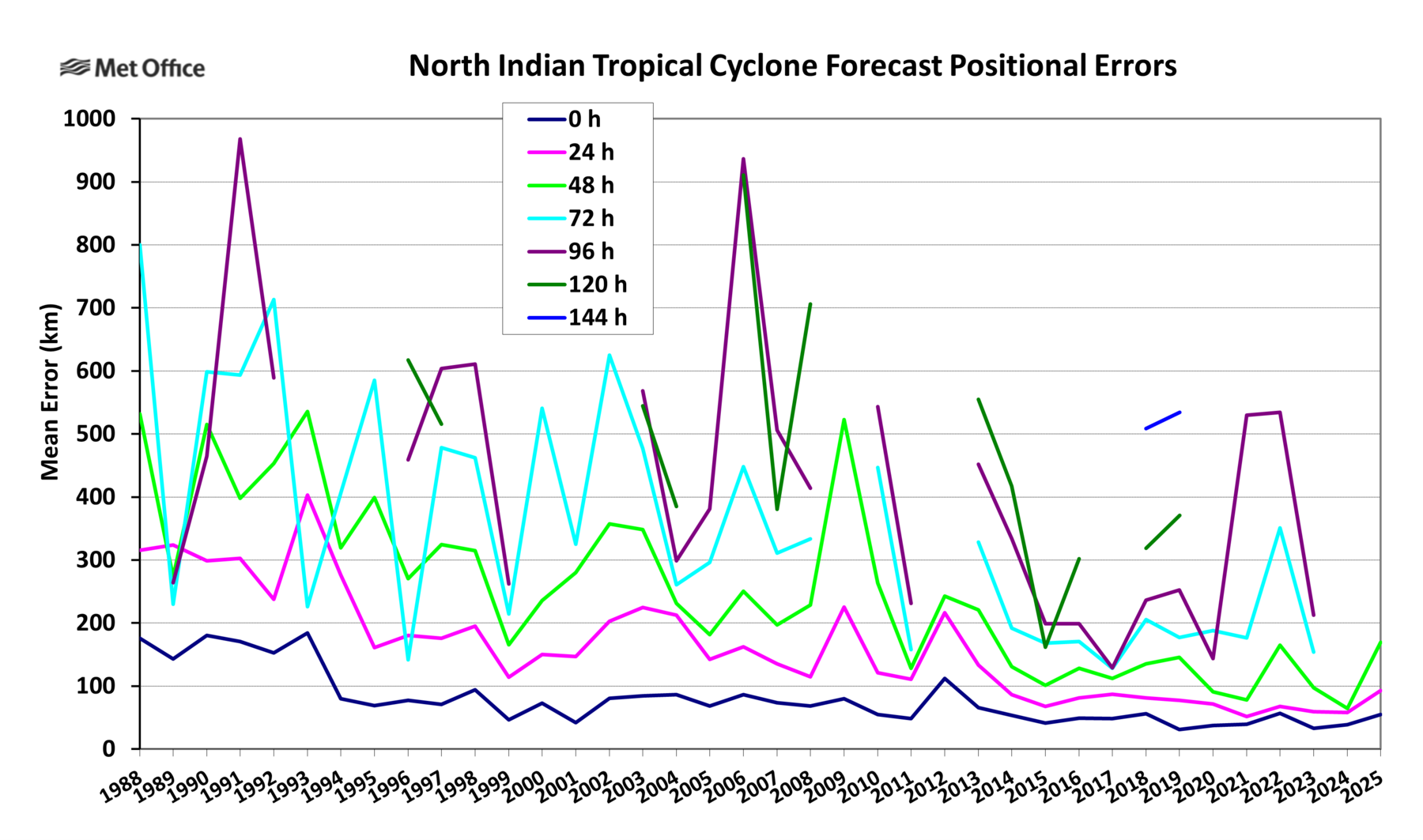 The Met Office tropical cyclone web pages contain information on tropical cyclone forecasting at the Met Office. Summaries of tropical cyclone observed activity and Met Office forecast track and intensity prediction errors are published at the end of each season, together with other useful information including lists of names and real-time tropical cyclone forecast guidance.