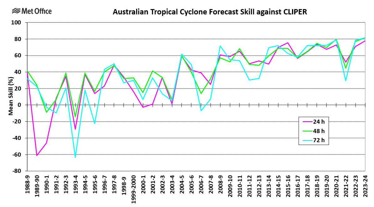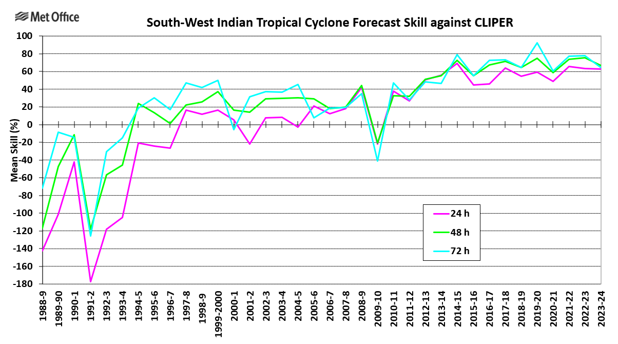The Met Office tropical cyclone web pages contain information on tropical cyclone forecasting at the Met Office. Summaries of tropical cyclone activity and forecasts are made at the end of each season, together with observed and forecast track information, track and intensity prediction error statistics, lists of names and real-time tropical cyclone forecast guidance.