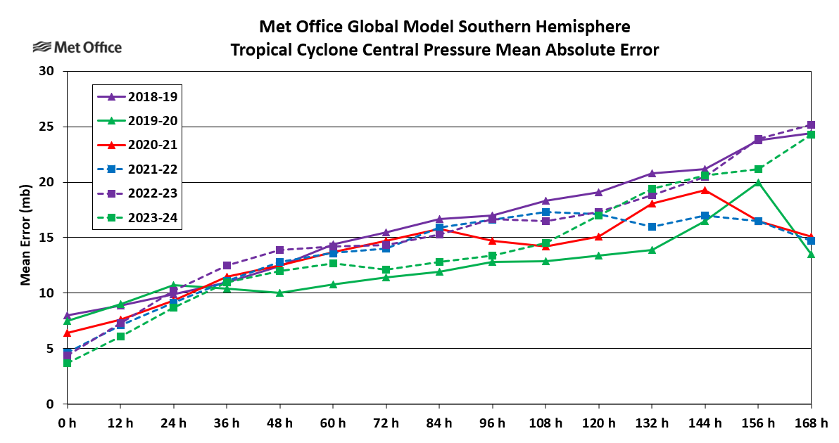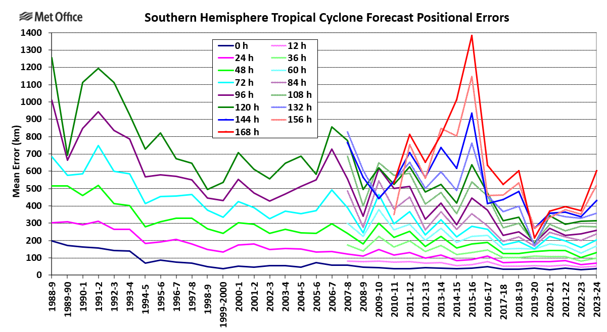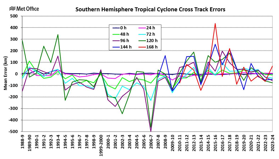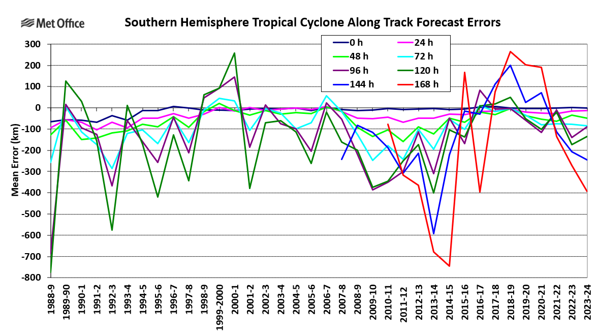 Tropical cyclones are experienced in the South Indian Ocean, tropical seas to the west, north and east of Australia and the western and central South Pacific Ocean. There are also occasional tropical or subtropical storms in the South Atlantic Ocean. For the purpose of tropical cyclone verification the Southern Hemisphere is divided in to three basins; the South-West Indian (west of 90° E), Australian (east of 90° E) and South Atlantic. Mean error statistics for each basin are presented together with a table of statistics for the whole Southern Hemisphere. The global model produces a seven-day forecast every 12 hours. Verification is performed at 12-hour intervals up to forecast time T+168, although statistics are only presented at 24-hour intervals in this report.