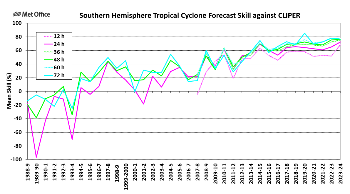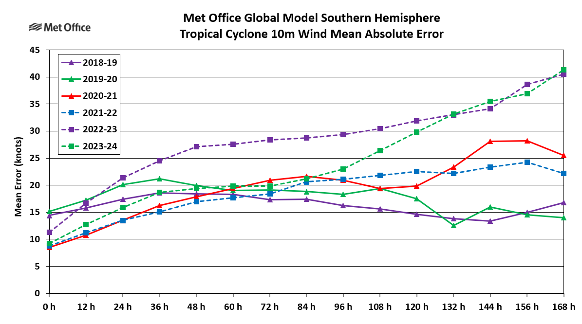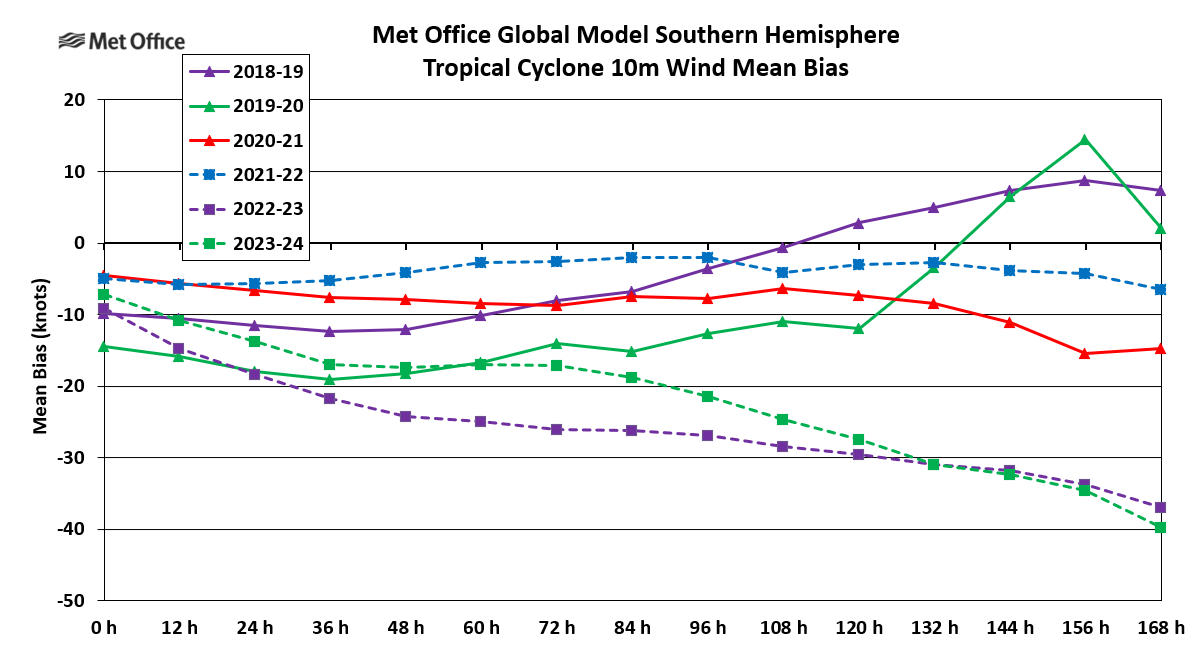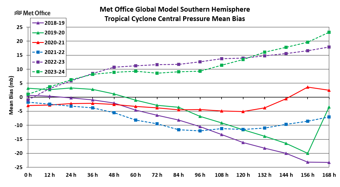Tropical cyclones are experienced in the South Indian Ocean, tropical seas to the west, north and east of Australia and the western and central South Pacific Ocean. There are also occasional tropical or subtropical storms in the South Atlantic Ocean. For the purpose of tropical cyclone verification the Southern Hemisphere is divided in to three basins; the South-West Indian (west of 90° E), Australian (east of 90° E) and South Atlantic. Mean error statistics for each basin are presented together with a table of statistics for the whole Southern Hemisphere. The global model produces a seven-day forecast every 12 hours. Verification is performed at 12-hour intervals up to forecast time T+168, although statistics are only presented at 24-hour intervals in this report.