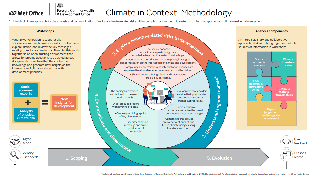 The ‘Climate in Context Methodology’ report provides full details on the methodology for the Climate risk Reports and sets out guidance on best practice for undertaking assessments of future climate risk at regional or national scales, for international development planners and policymakers.