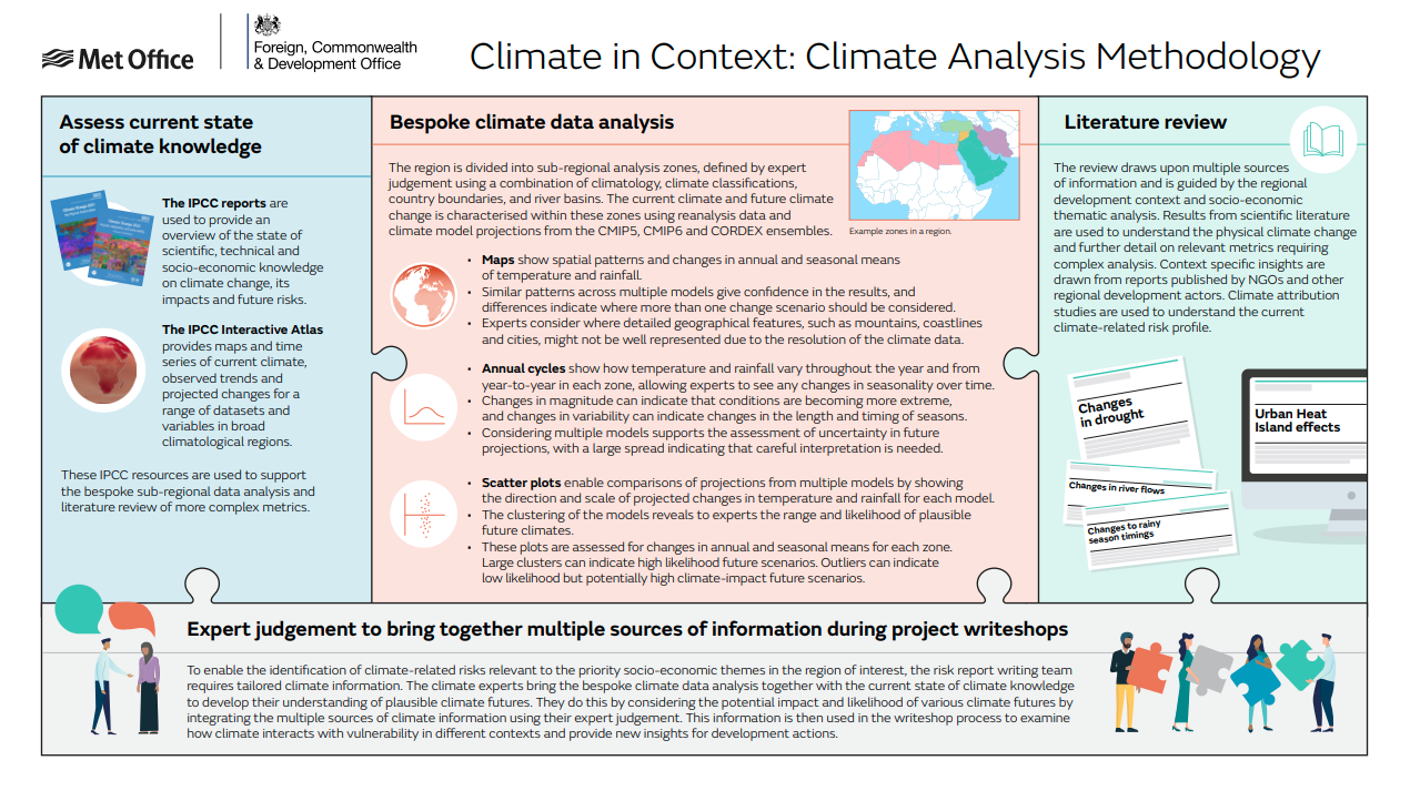 The climate risk reports are a series of regional climate risk reports the Met Office has produced in collaboration with ODI and commissioned by FCDO to provide evidence to the UK Government in support of adaptation and resilience planning and investments. Climate risk is a combination of hazard, exposure, and vulnerability, making it critical to evaluate climate information in the context of the lives and livelihoods of the populations affected. This means understanding how different levels of action will impact human security and development for mitigation and providing information for the committed climate change to evaluate available options to manage exposure and vulnerability for adaptation. A risk-based approach helps to frame climate change challenges in a way that can best inform action to tackle those challenges and build climate resilience.