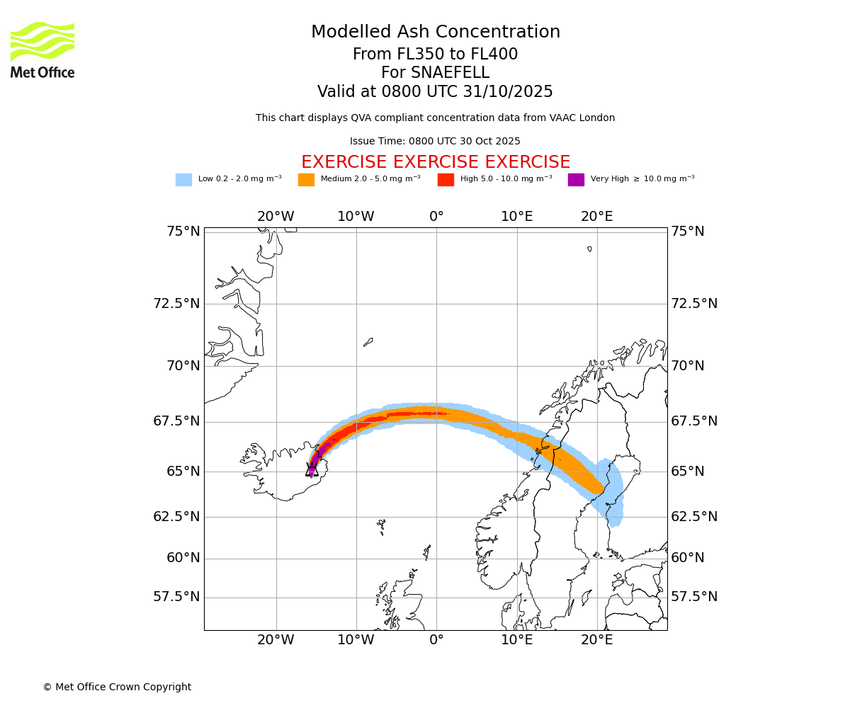 Modelled ash concentration from 300 to 350 for SNAEFELL. Valid at 0800 UTC 31/10/2025