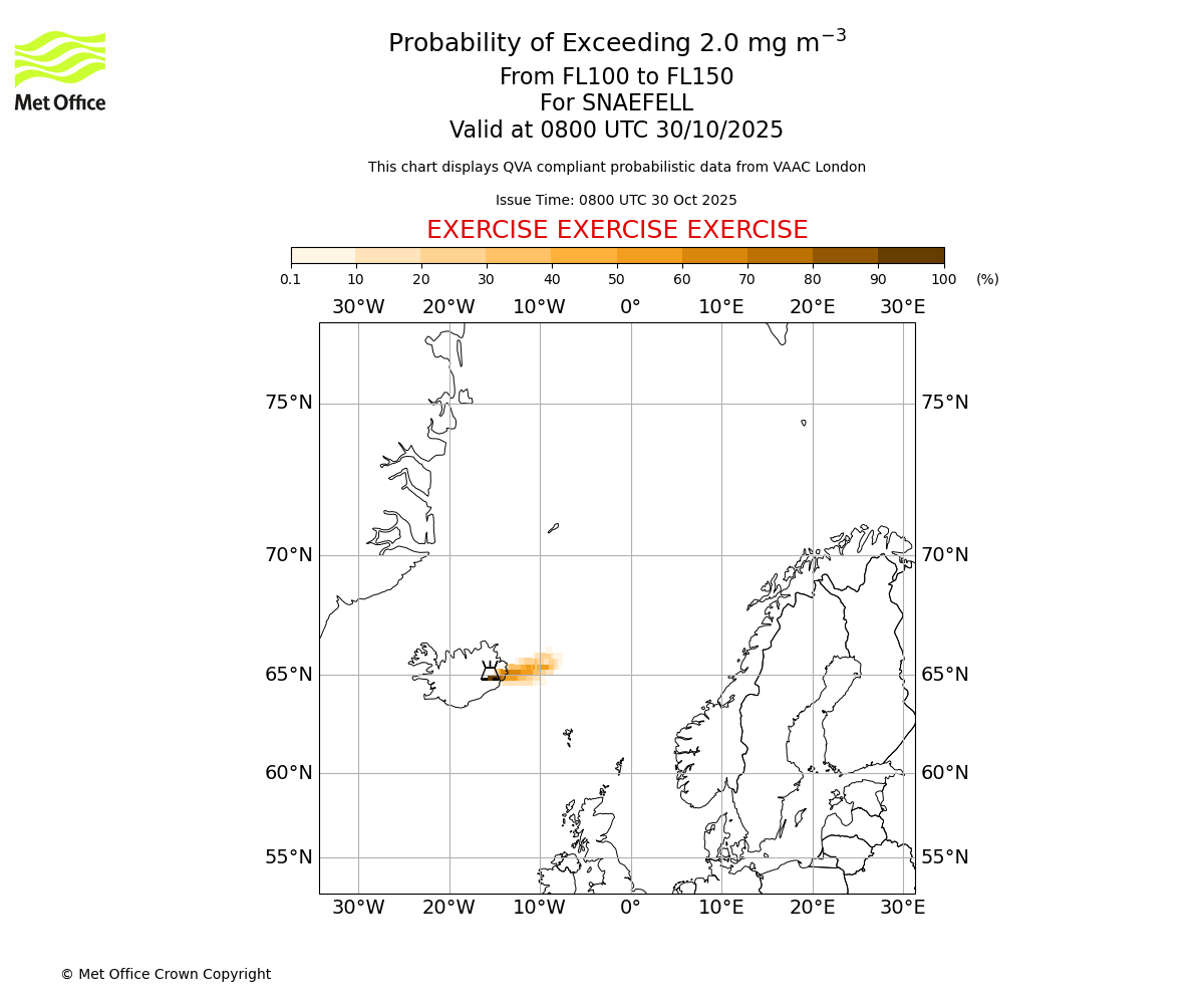 Probability of exceeding 2.0 milligrams per metre cubed. From 050 to 100 for SNAEFELL. Valid at 0800 UTC 30/10/2025