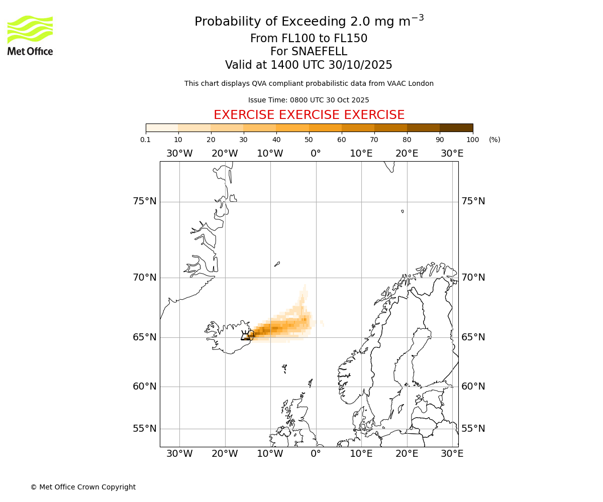 Probability of exceeding 2.0 milligrams per metre cubed. From 100 to 150 for SNAEFELL. Valid at 1100 UTC 30/10/2025
