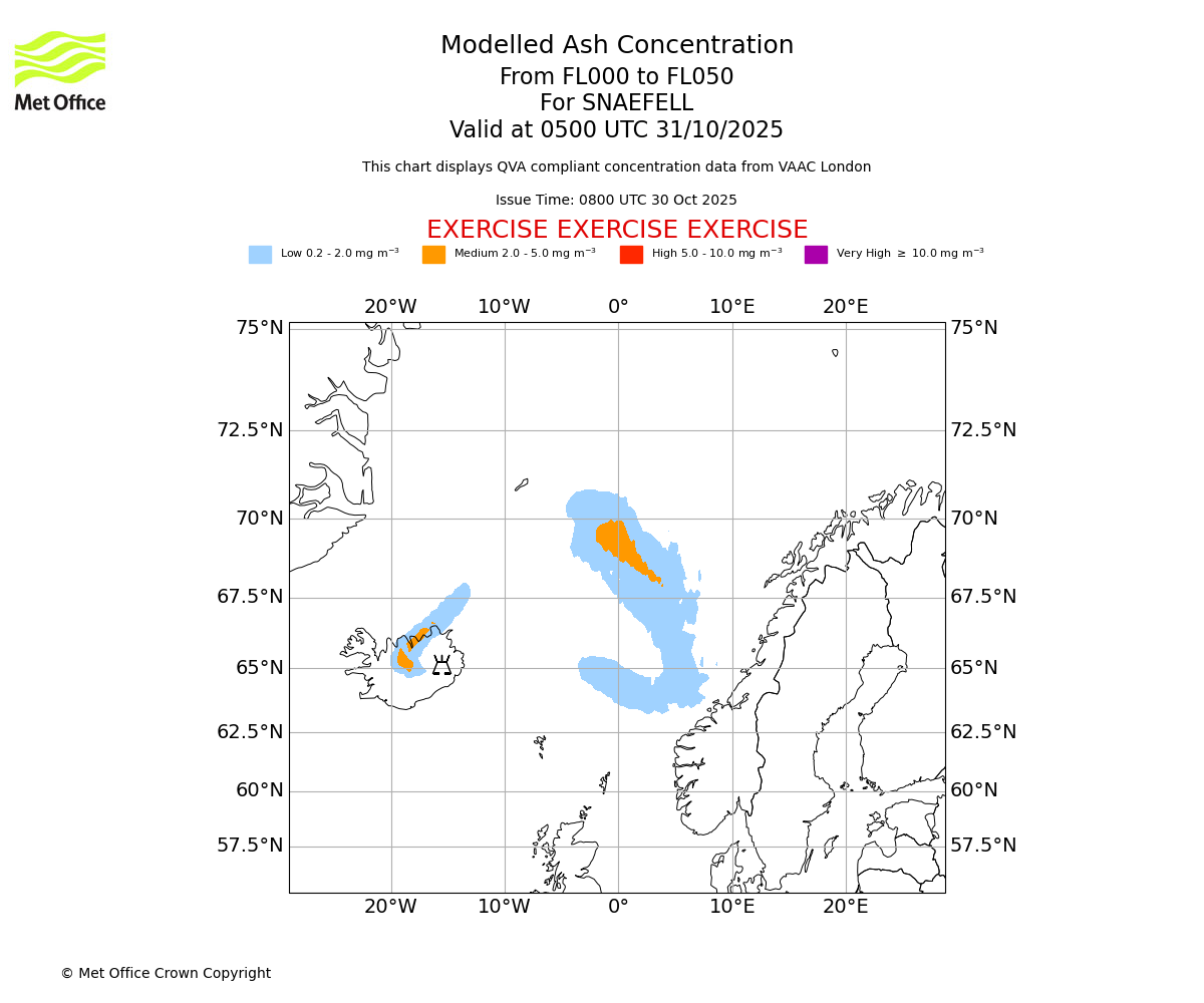 Modelled ash concentration from 000 to 050 for SNAEFELL. Valid at 0200 UTC 31/10/2025