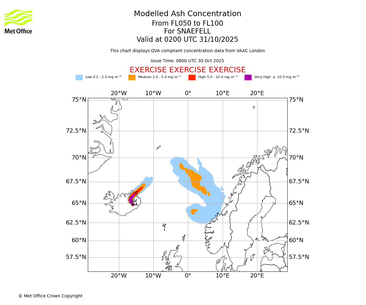 Modelled ash concentration from 000 to 200 for SNAEFELL. Valid at 0200 UTC 31/10/2025