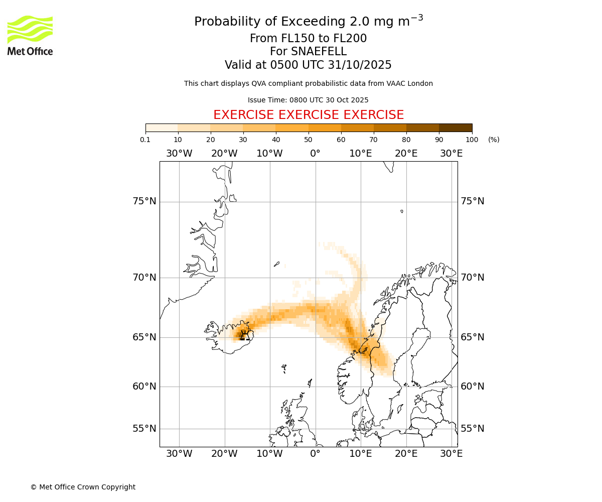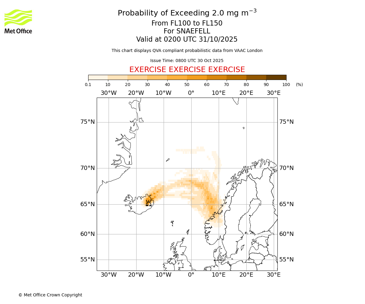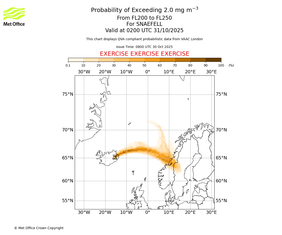 Probability of exceeding 2.0 milligrams per metre cubed. From 150 to 200 for SNAEFELL. Valid at 0200 UTC 31/10/2025