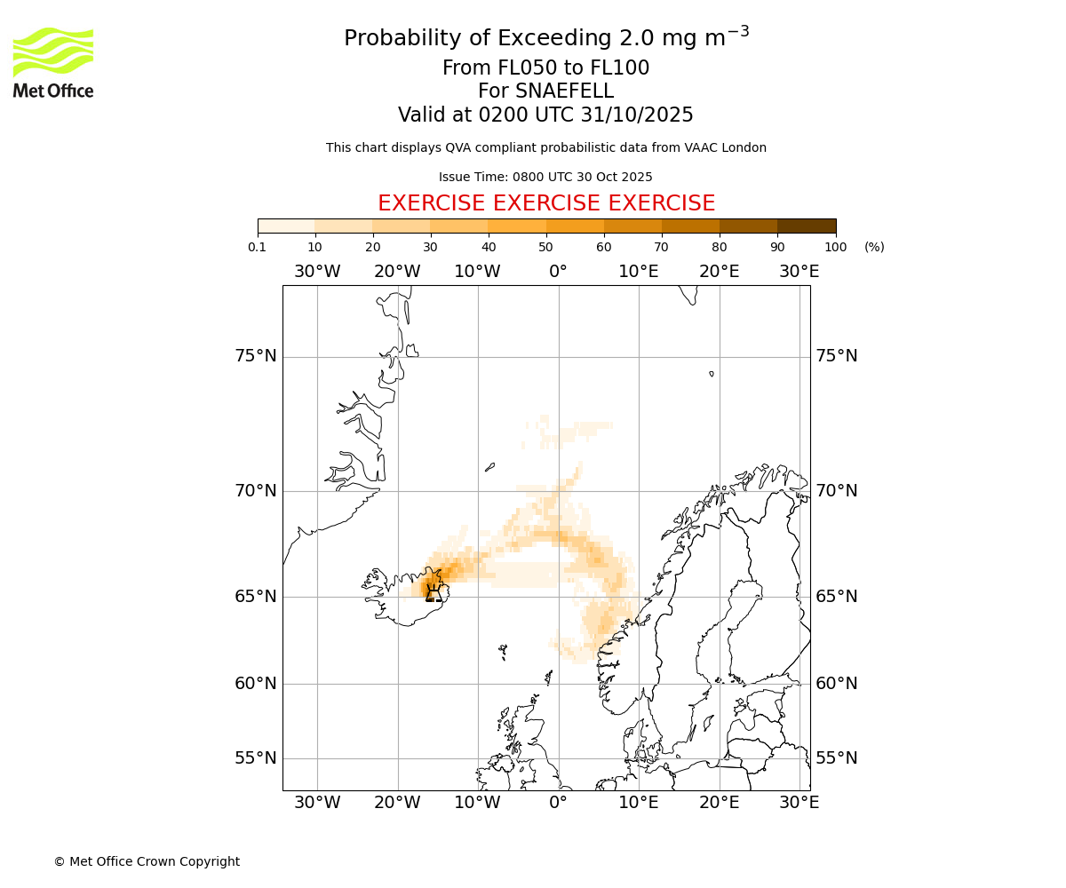 Probability of exceeding 2.0 milligrams per metre cubed. From 000 to 050 for SNAEFELL. Valid at 0200 UTC 31/10/2025