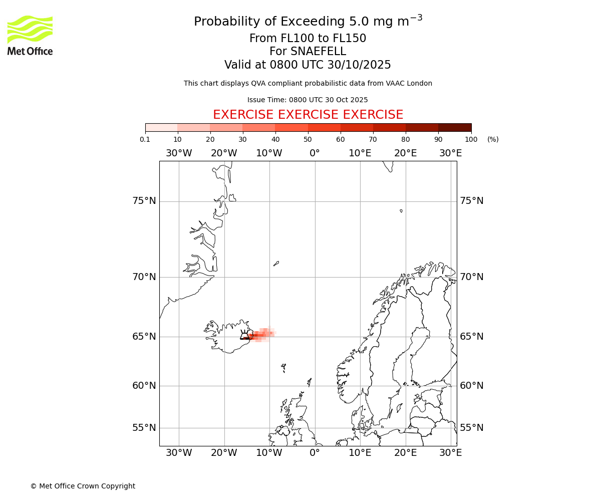 Probability of exceeding 5.0 milligrams per metre cubed. From 050 to 100 for SNAEFELL. Valid at 0800 UTC 30/10/2025