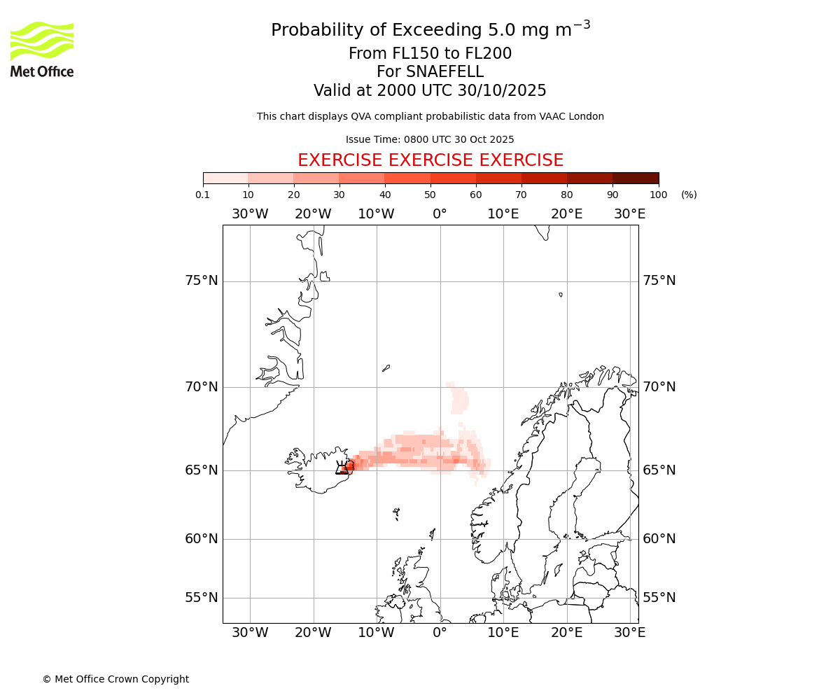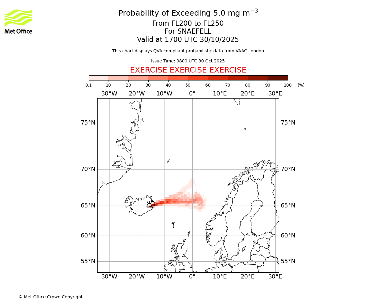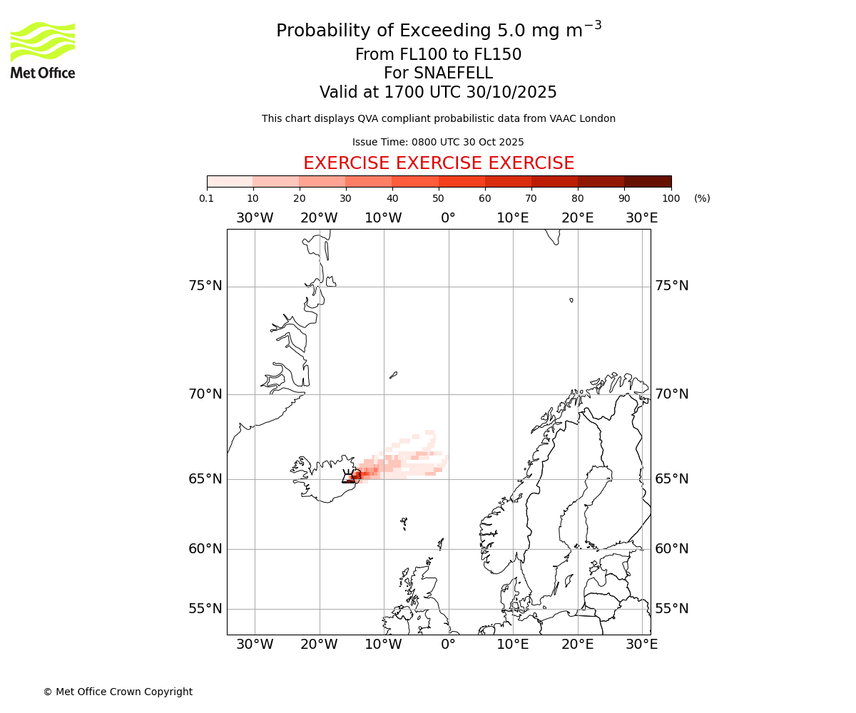 Probability of exceeding 5.0 milligrams per metre cubed. From 150 to 200 for SNAEFELL. Valid at 1700 UTC 30/10/2025