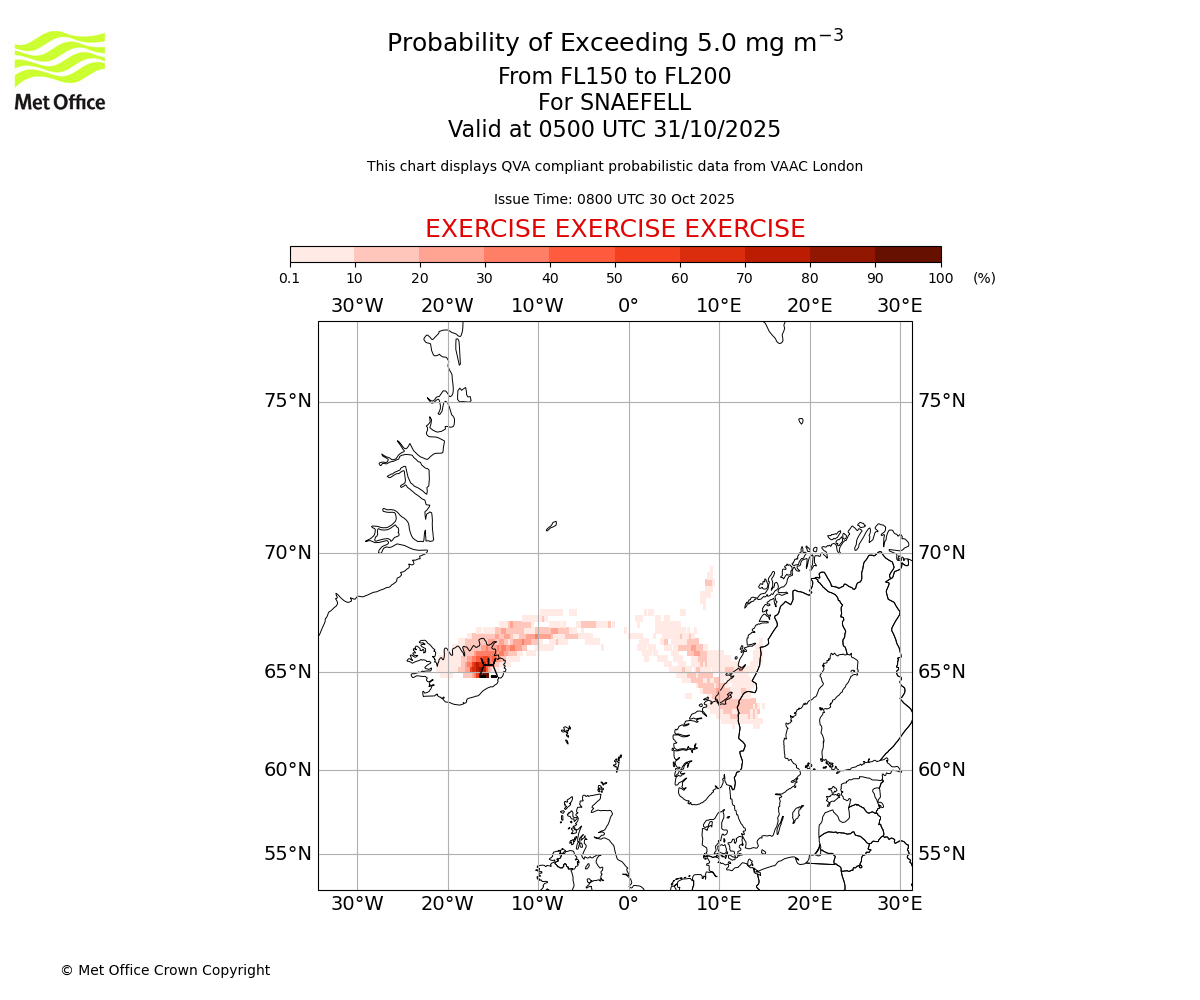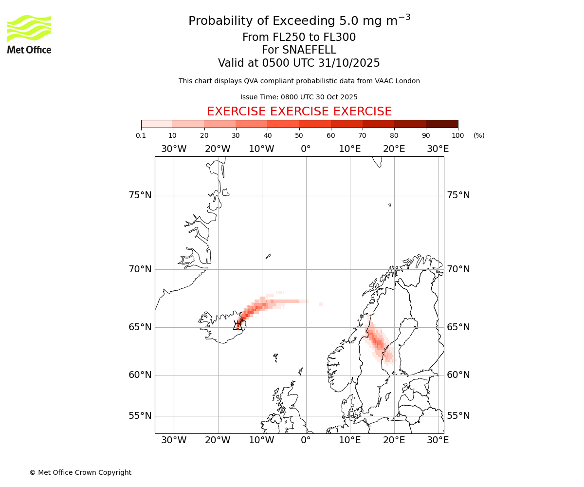 Probability of exceeding 5.0 milligrams per metre cubed. From 200 to 250 for SNAEFELL. Valid at 0500 UTC 31/10/2025