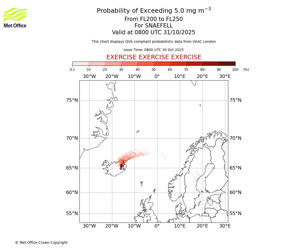 Modelled ash concentration from 000 to 200 for SNAEFELL. Valid at 0800 UTC 31/10/2025