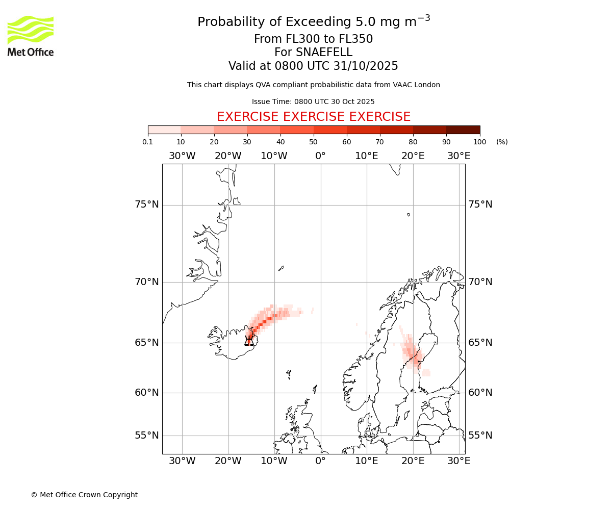 Probability of exceeding 5.0 milligrams per metre cubed. From 250 to 300 for SNAEFELL. Valid at 0800 UTC 31/10/2025