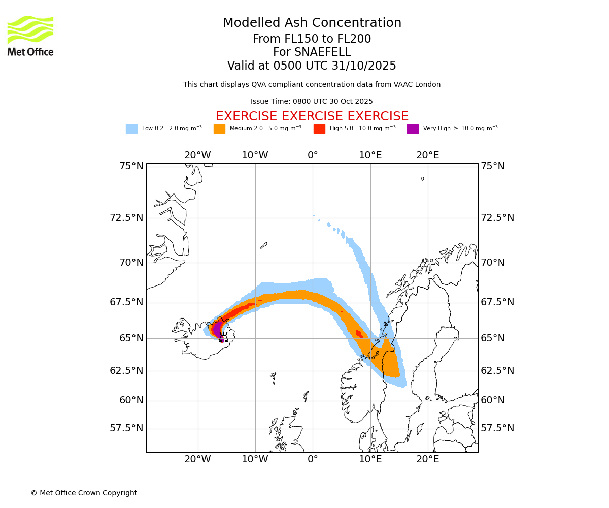 Modelled ash concentration from 150 to 200 for SNAEFELL. Valid at 0200 UTC 31/10/2025
