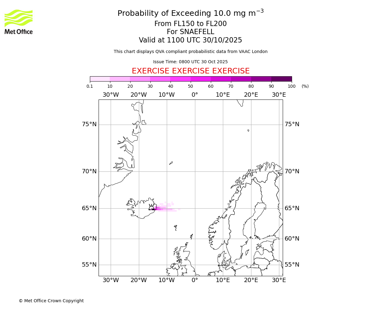 Probability of exceeding 10.0 milligrams per metre cubed. From 100 to 150 for SNAEFELL. Valid at 1100 UTC 30/10/2025