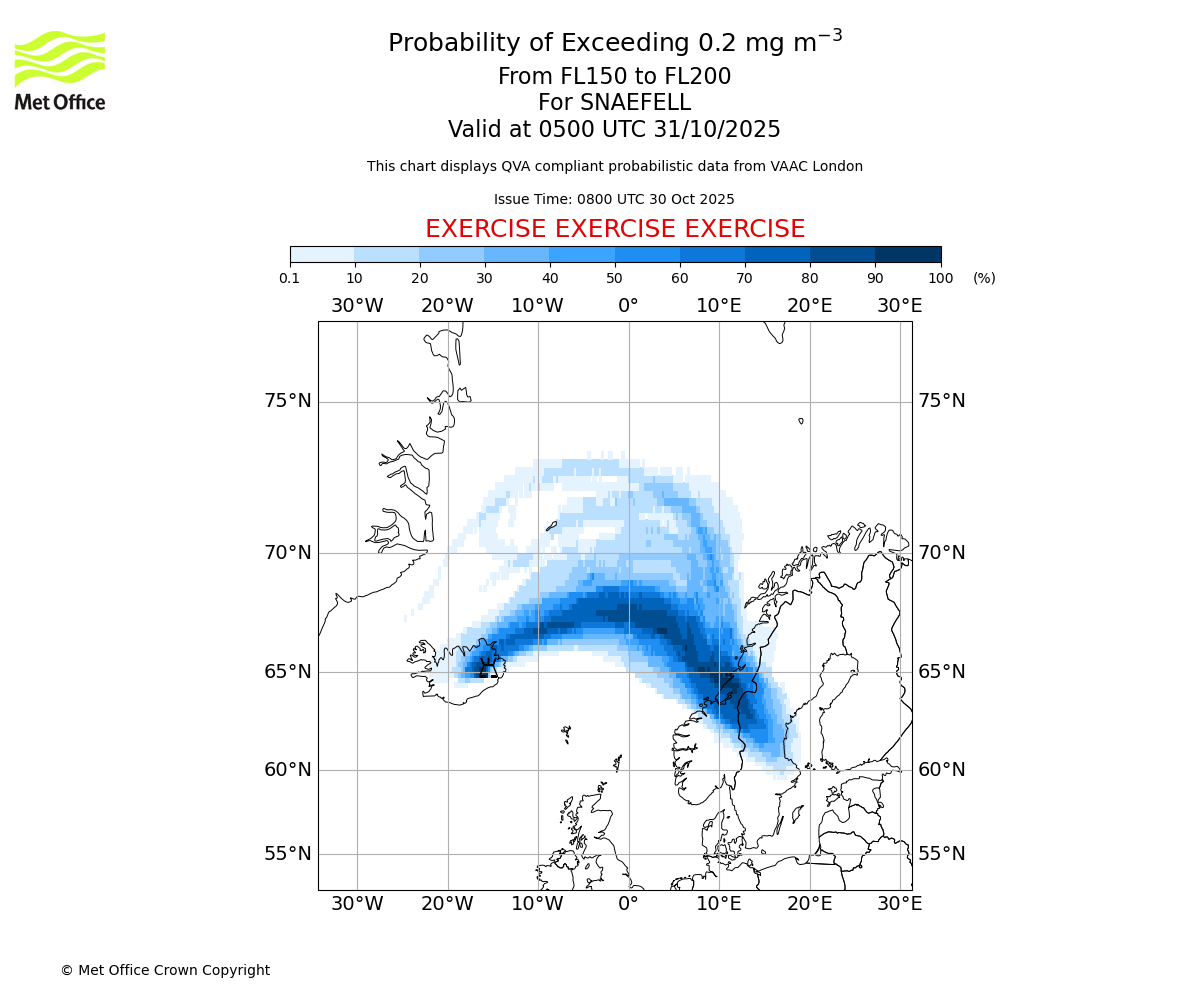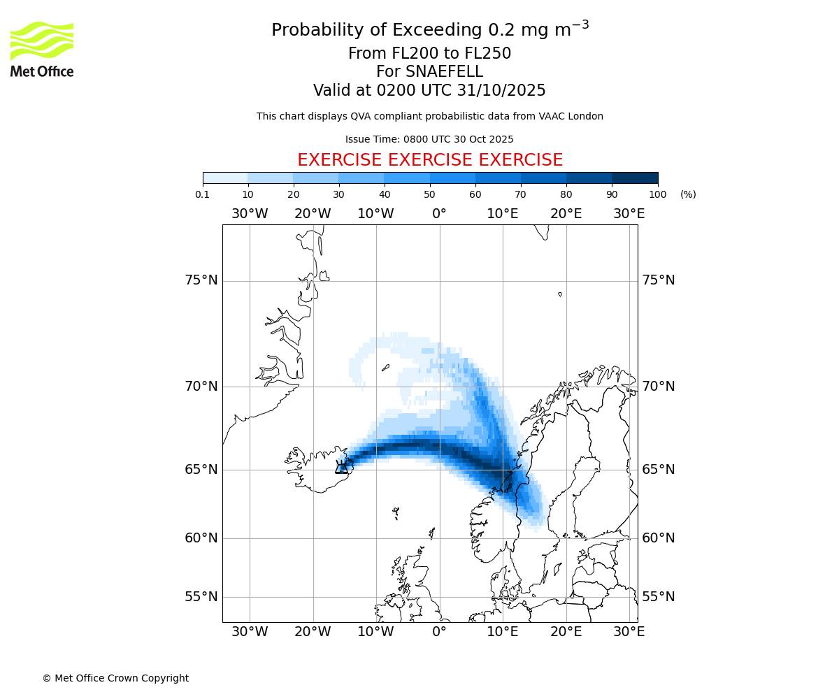 Probability of exceeding 0.2 milligrams per metre cubed. From 150 to 200 for SNAEFELL. Valid at 0200 UTC 31/10/2025