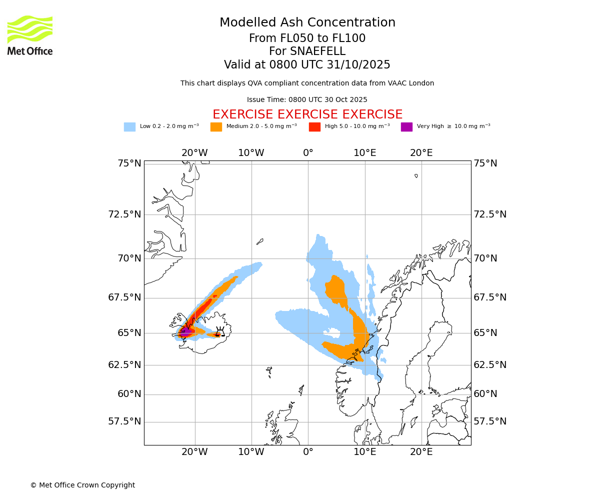 Modelled ash concentration from 050 to 100 for SNAEFELL. Valid at 0500 UTC 31/10/2025