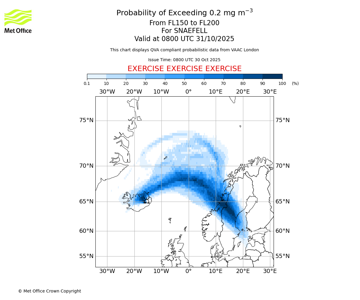 Probability of exceeding 0.2 milligrams per metre cubed. From 150 to 200 for SNAEFELL. Valid at 0500 UTC 31/10/2025