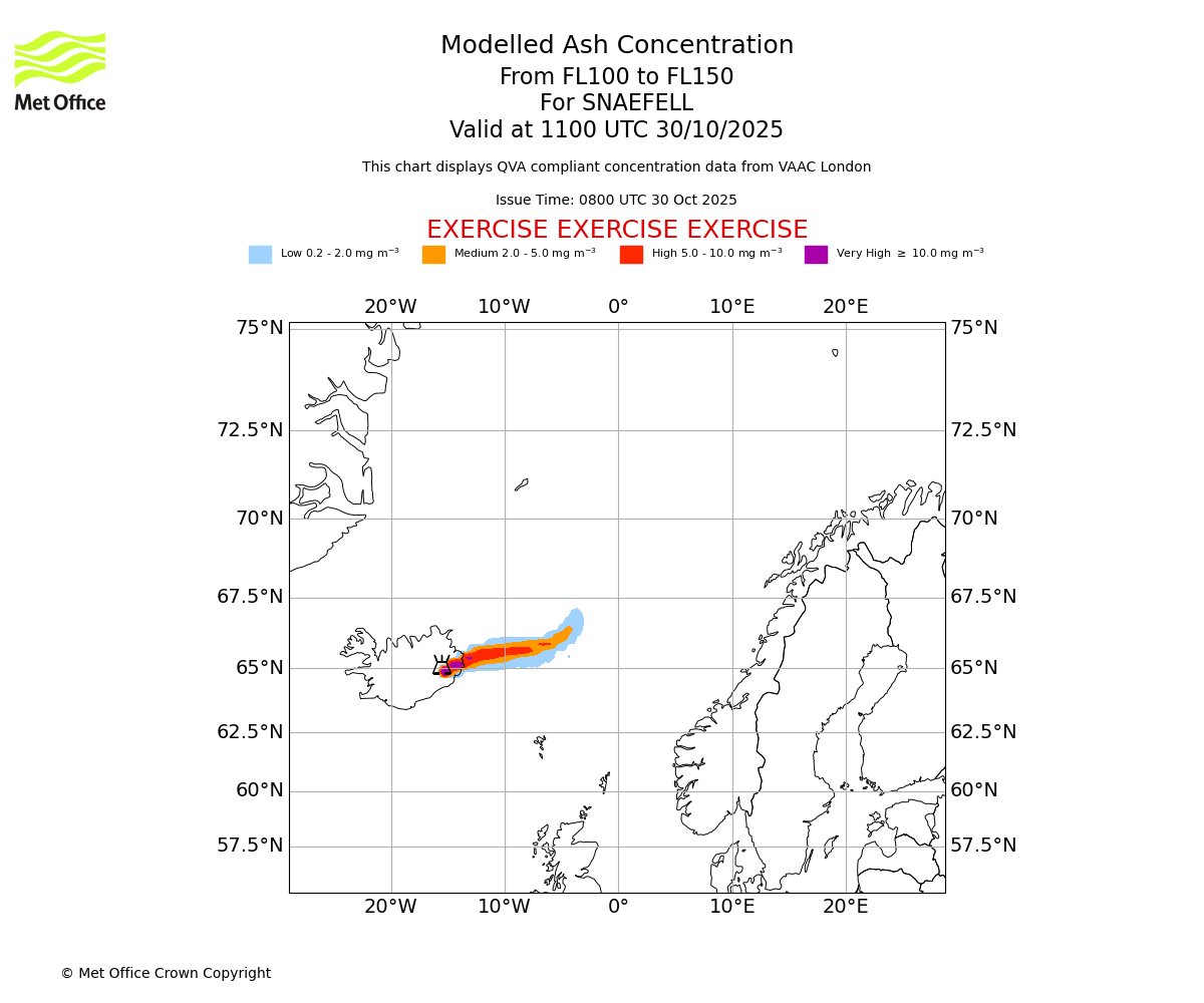 Modelled ash concentration from 050 to 100 for SNAEFELL. Valid at 1100 UTC 30/10/2025