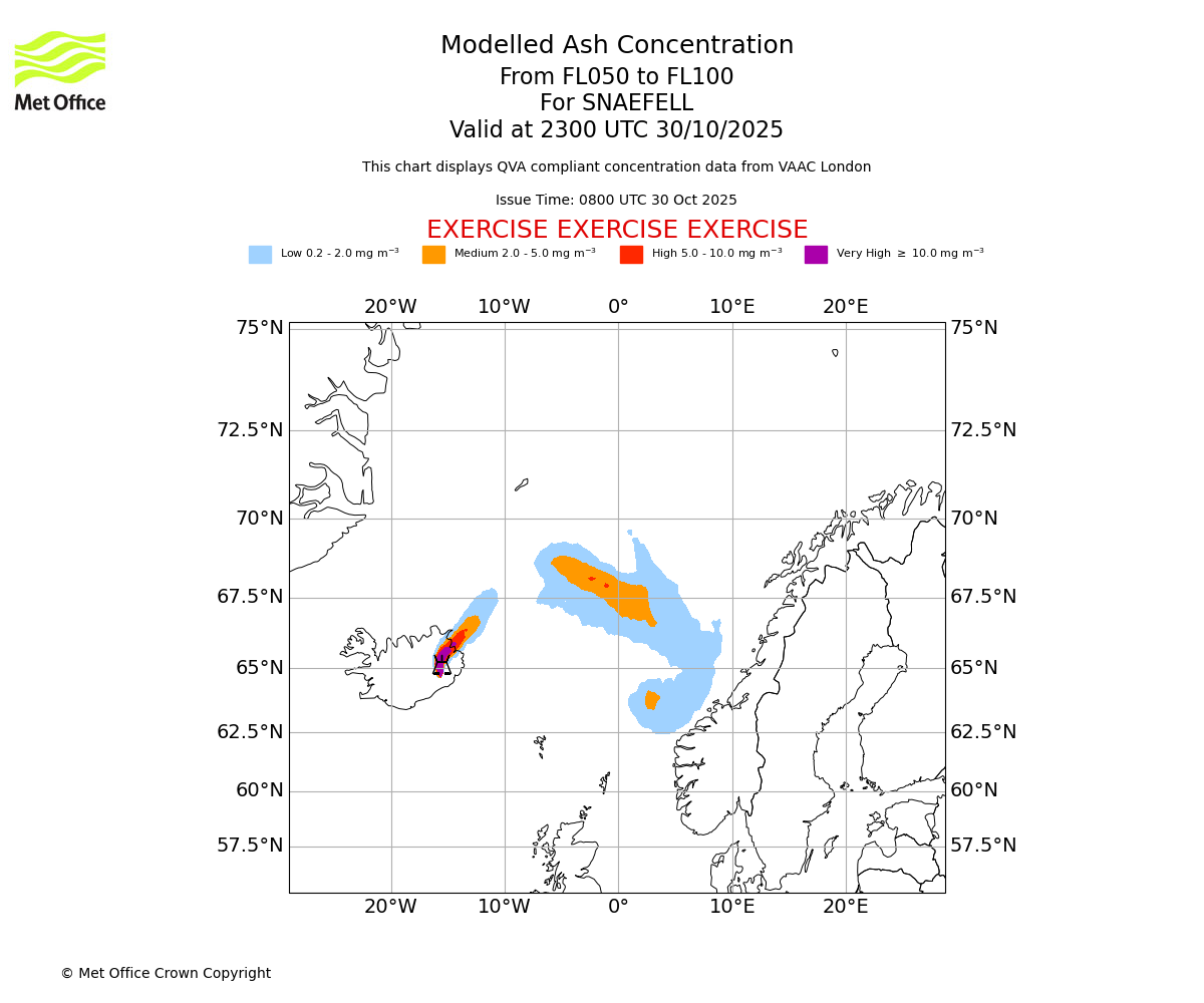 Modelled ash concentration from 050 to 100 for SNAEFELL. Valid at 2000 UTC 30/10/2025