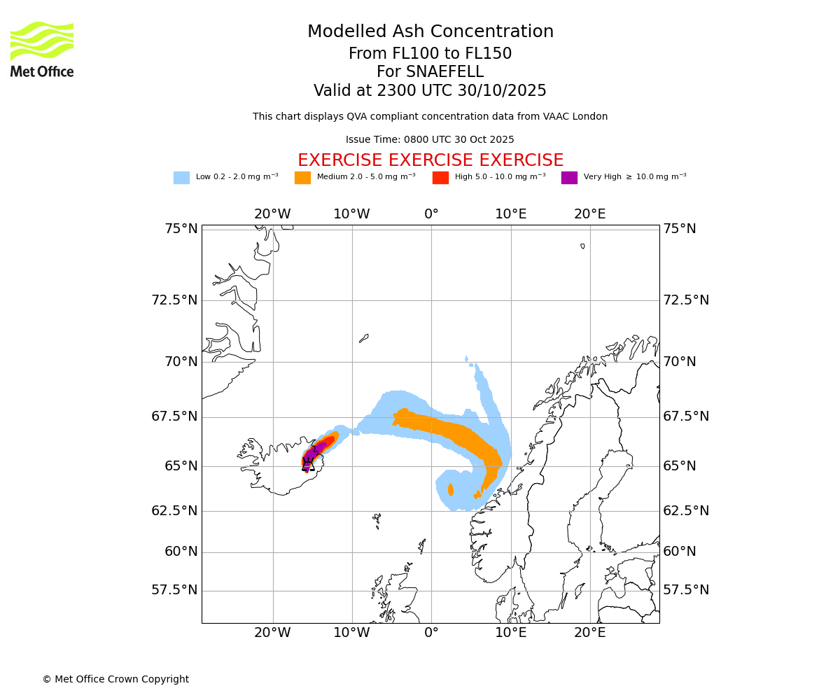 Modelled ash concentration from 100 to 150 for SNAEFELL. Valid at 2000 UTC 30/10/2025