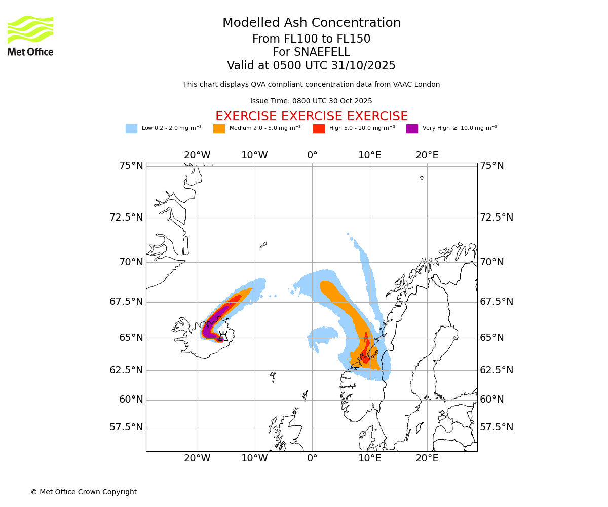 Modelled ash concentration from 100 to 150 for SNAEFELL. Valid at 0200 UTC 31/10/2025
