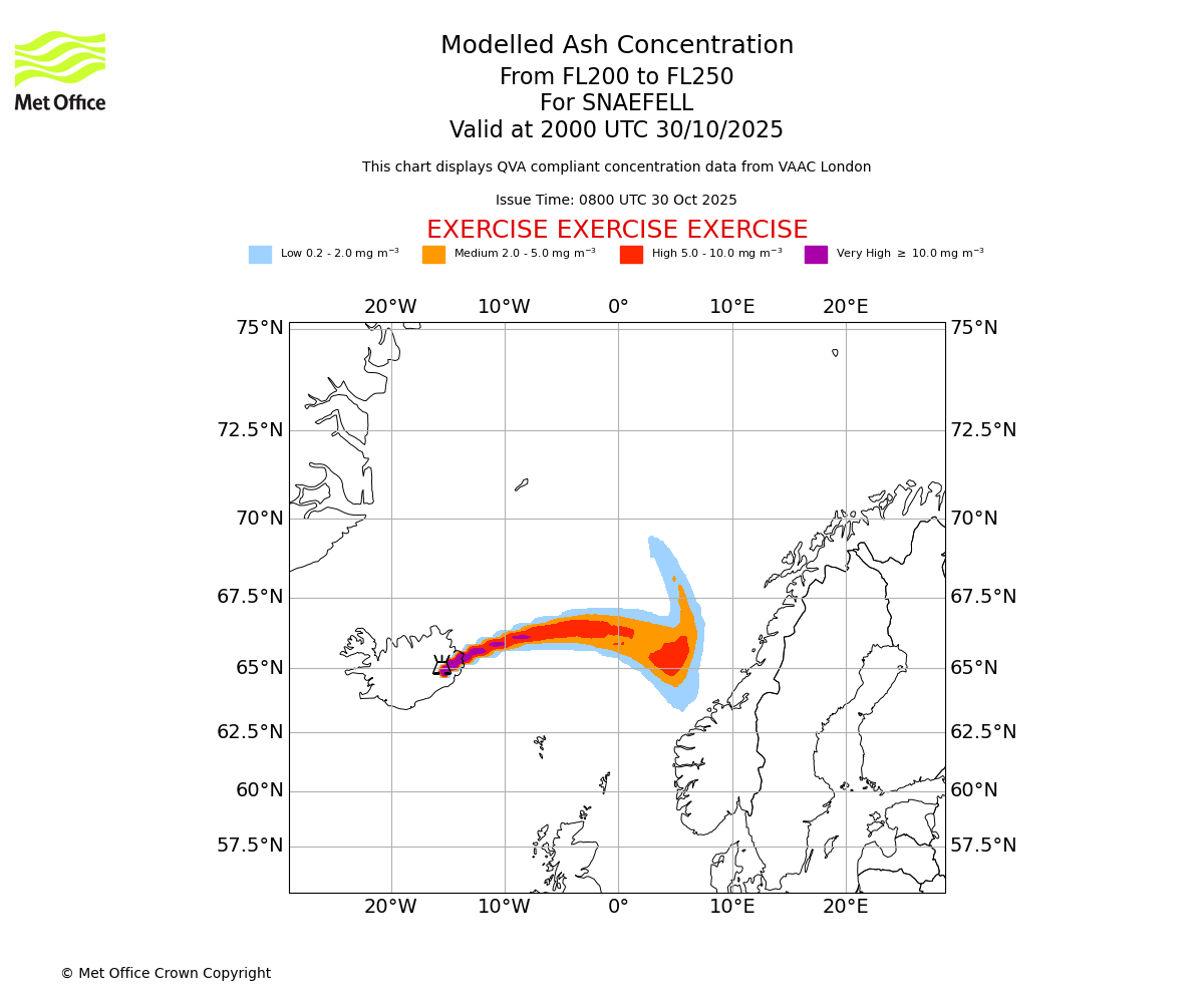 Modelled ash concentration from 000 to 200 for SNAEFELL. Valid at 2000 UTC 30/10/2025