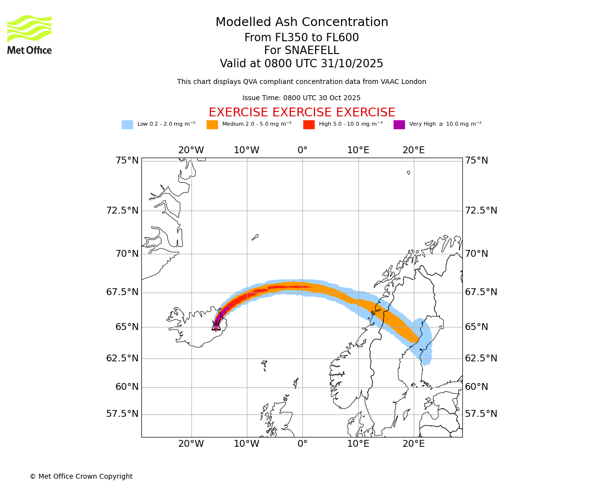Modelled ash concentration from 200 to 350 for SNAEFELL. Valid at 0800 UTC 31/10/2025