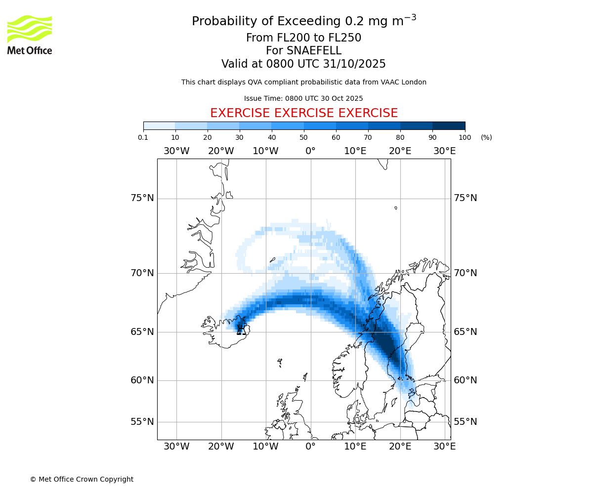 Probability of exceeding 0.2 milligrams per metre cubed. From 200 to 250 for SNAEFELL. Valid at 0500 UTC 31/10/2025