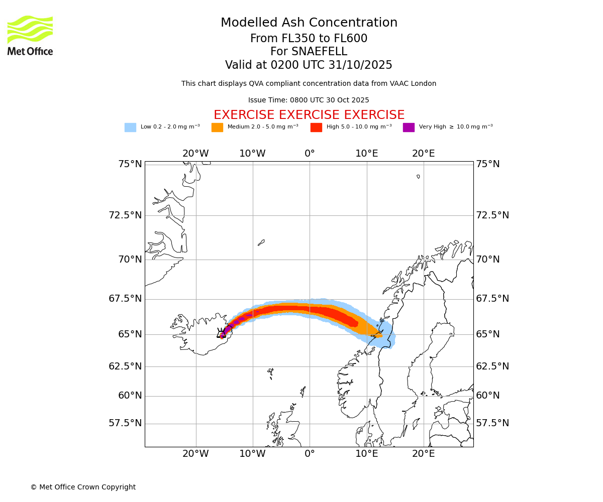 Modelled ash concentration from 350 to 600 for SNAEFELL. Valid at 2000 UTC 30/10/2025