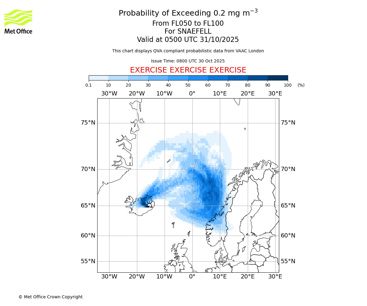 Probability of exceeding 0.2 milligrams per metre cubed. From 050 to 100 for SNAEFELL. Valid at 0200 UTC 31/10/2025