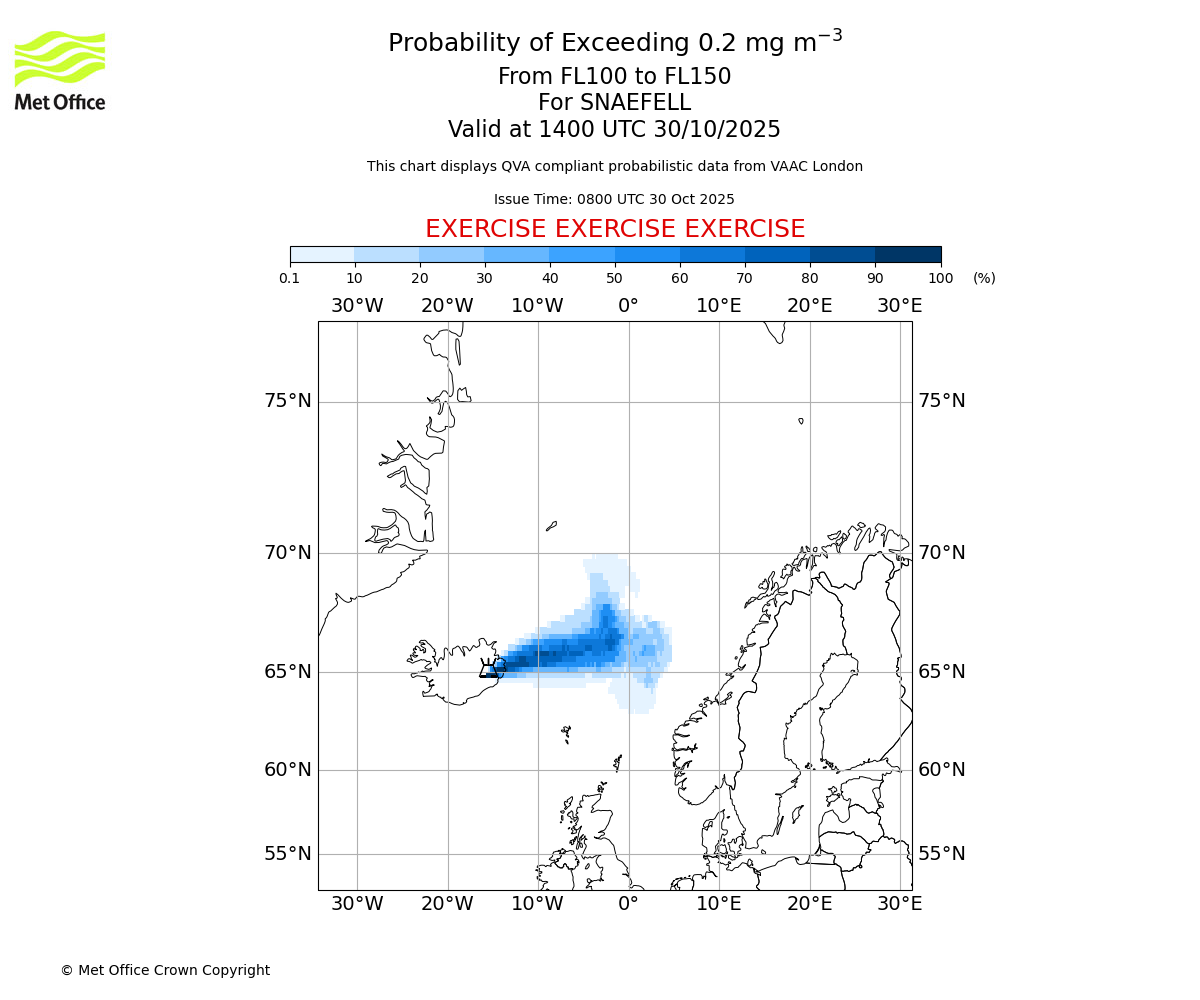 Probability of exceeding 0.2 milligrams per metre cubed. From 100 to 150 for SNAEFELL. Valid at 1100 UTC 30/10/2025