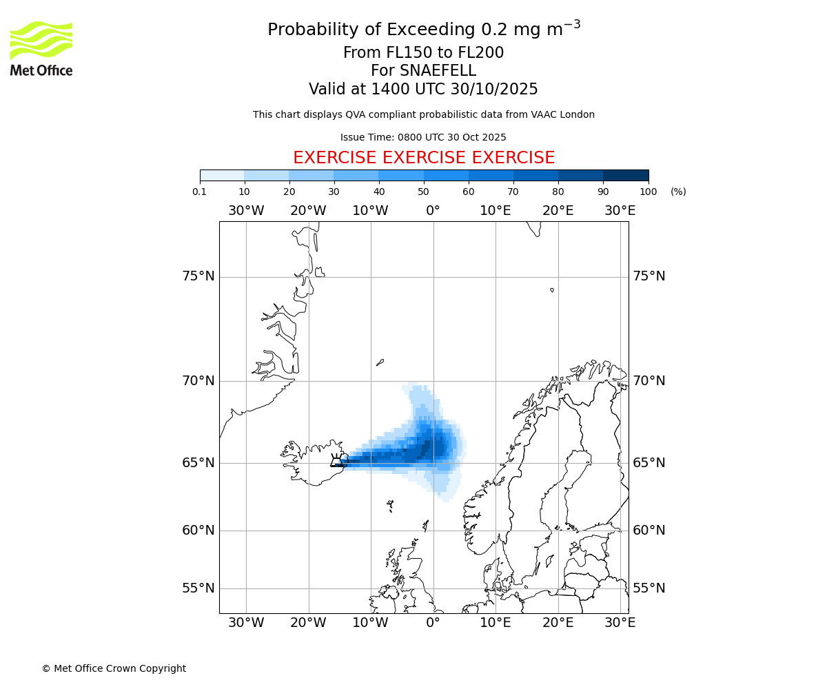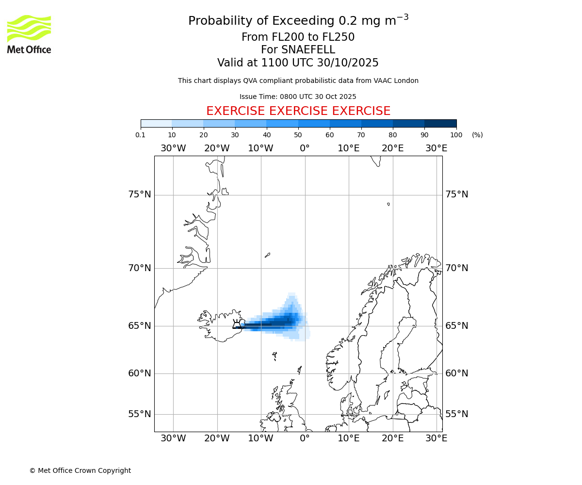 Probability of exceeding 0.2 milligrams per metre cubed. From 150 to 200 for SNAEFELL. Valid at 1100 UTC 30/10/2025