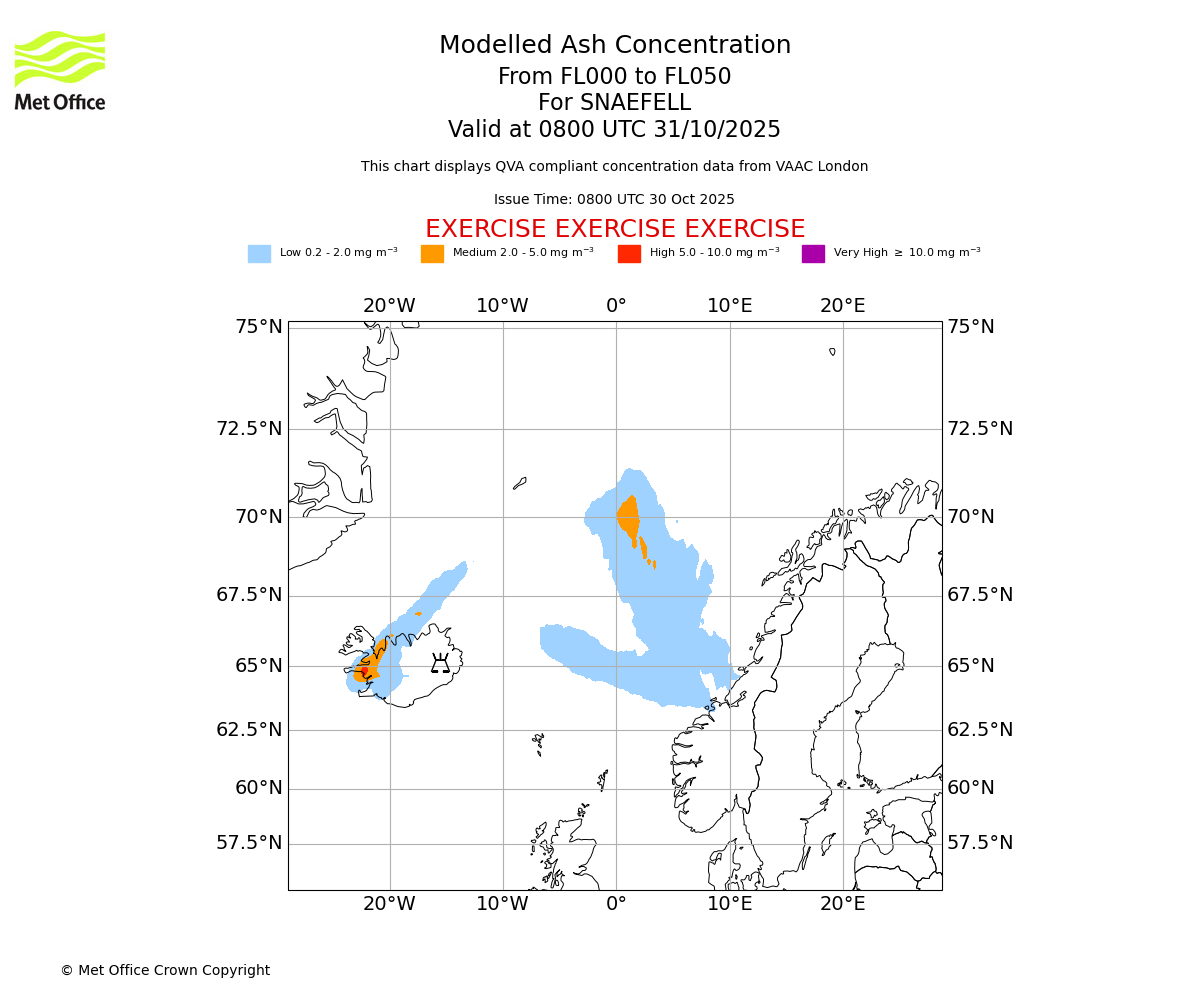 Modelled ash concentration from 000 to 200 for SNAEFELL. Valid at 0800 UTC 31/10/2025