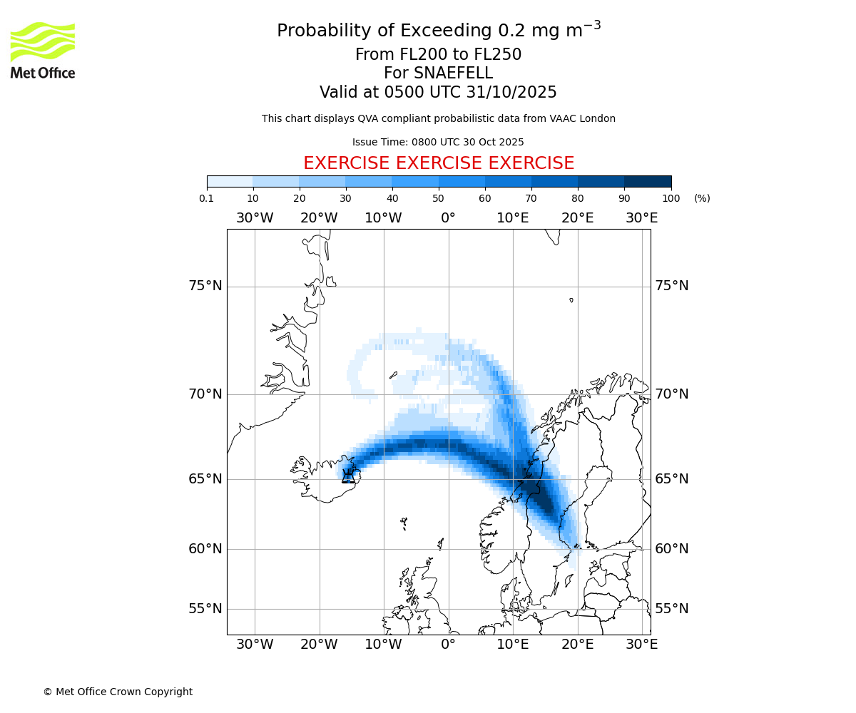 Probability of exceeding 0.2 milligrams per metre cubed. From 250 to 300 for SNAEFELL. Valid at 0500 UTC 31/10/2025