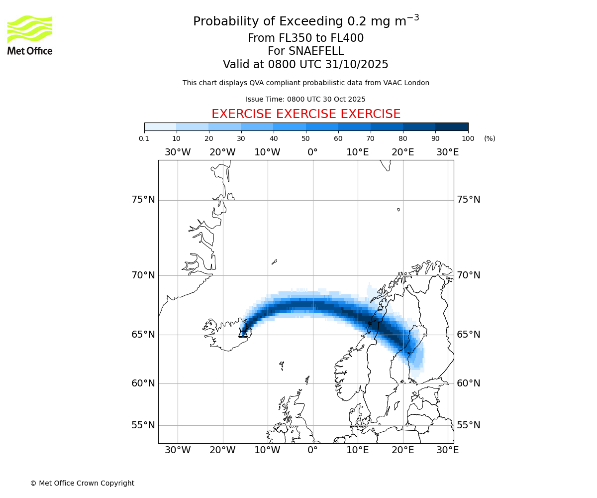 Probability of exceeding 0.2 milligrams per metre cubed. From 300 to 350 for SNAEFELL. Valid at 0800 UTC 31/10/2025