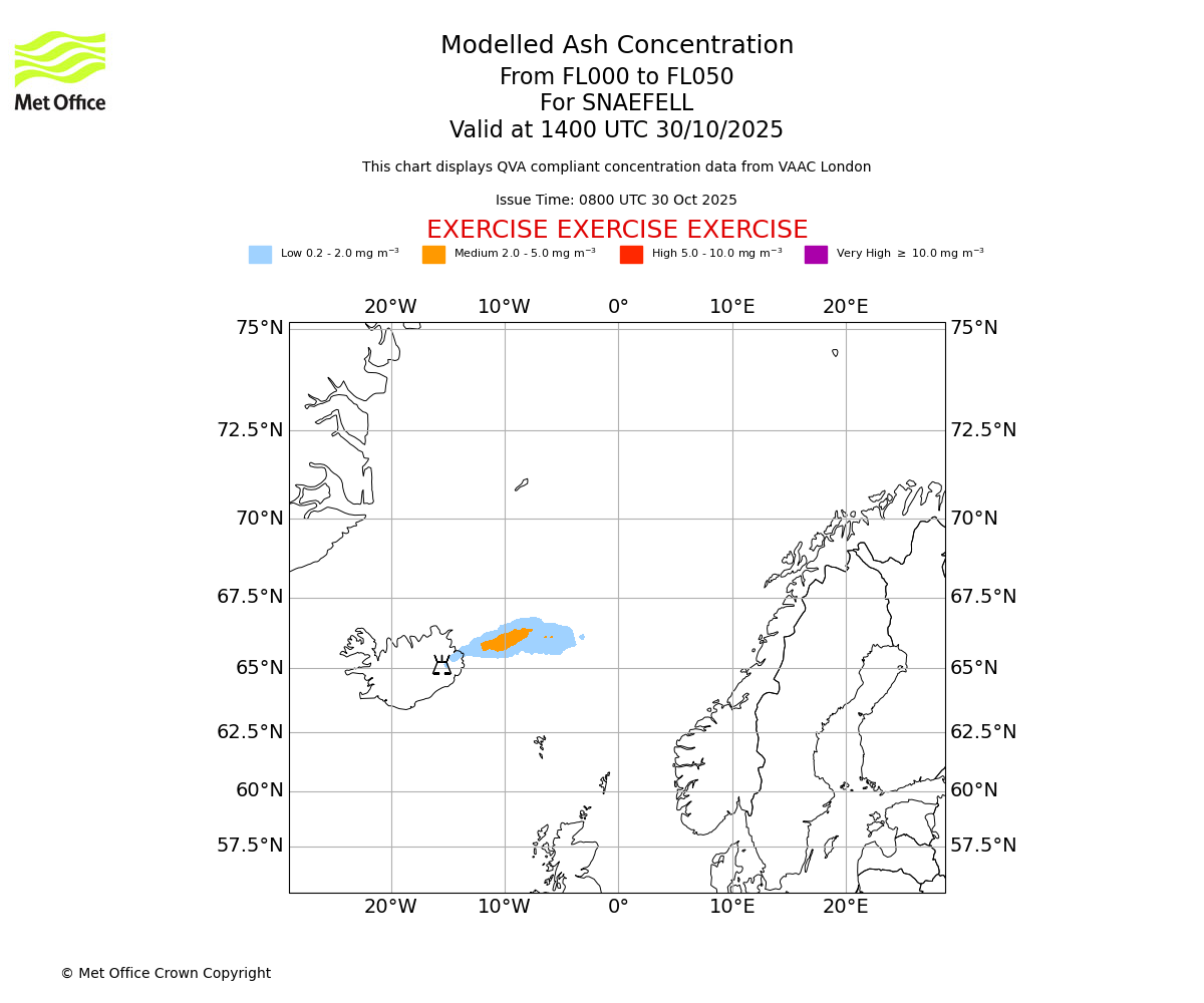Modelled ash concentration from 000 to 200 for SNAEFELL. Valid at 0800 UTC 30/10/2025