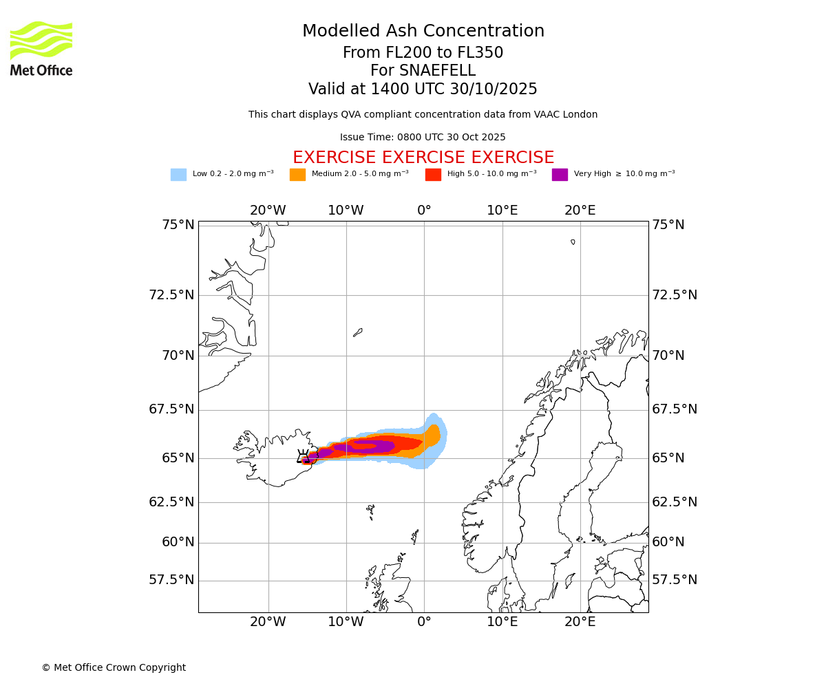 Modelled ash concentration from 000 to 200 for SNAEFELL. Valid at 1400 UTC 30/10/2025
